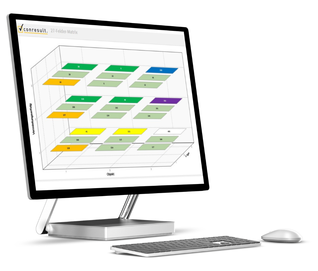 3-dimensionale Portfolio-Grafik mit farblicher Darstellung der unternehmensspezifischen Normstrategie, Druckausgabe von Objektsteckbriefen inkl. Darstellungsmöglichkeit von Bildmaterial mit Objektansichten, Detailnachweis der Portfoliodimensionen „Standortqualität“, „Objektqualität“ & „Wirtschaftlichkeit“, Wirtschaftseinheitsbezogene Deckungsbeitragsrechnung, Importoption für externe Bewertungskataloge sowie Investitionsplanungen, Abstimmungshilfen für Detaildaten aus Hauptbuch und Nebenbüchern (z.B. für Mietforderungen, Erlösschmälerungen Darlehenszinsen und-tilgung,…)